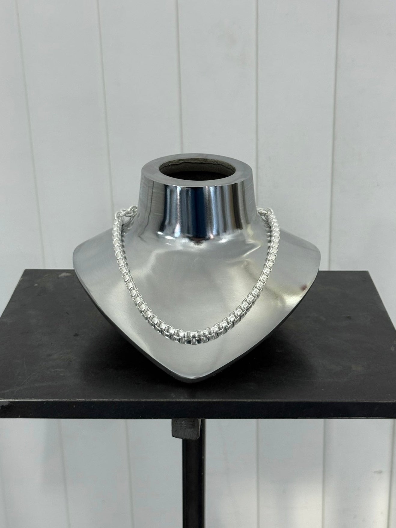 HANDMADE AT OUR BROOKLYN STUDIO. CREATED LINK BY LINK FROM STERLING SILVER COATED BRASS CHAIN, INDIVIDUALLY DIPPED, POLISHED + SEALED BY A MEMBER OF THE MA TEAM.