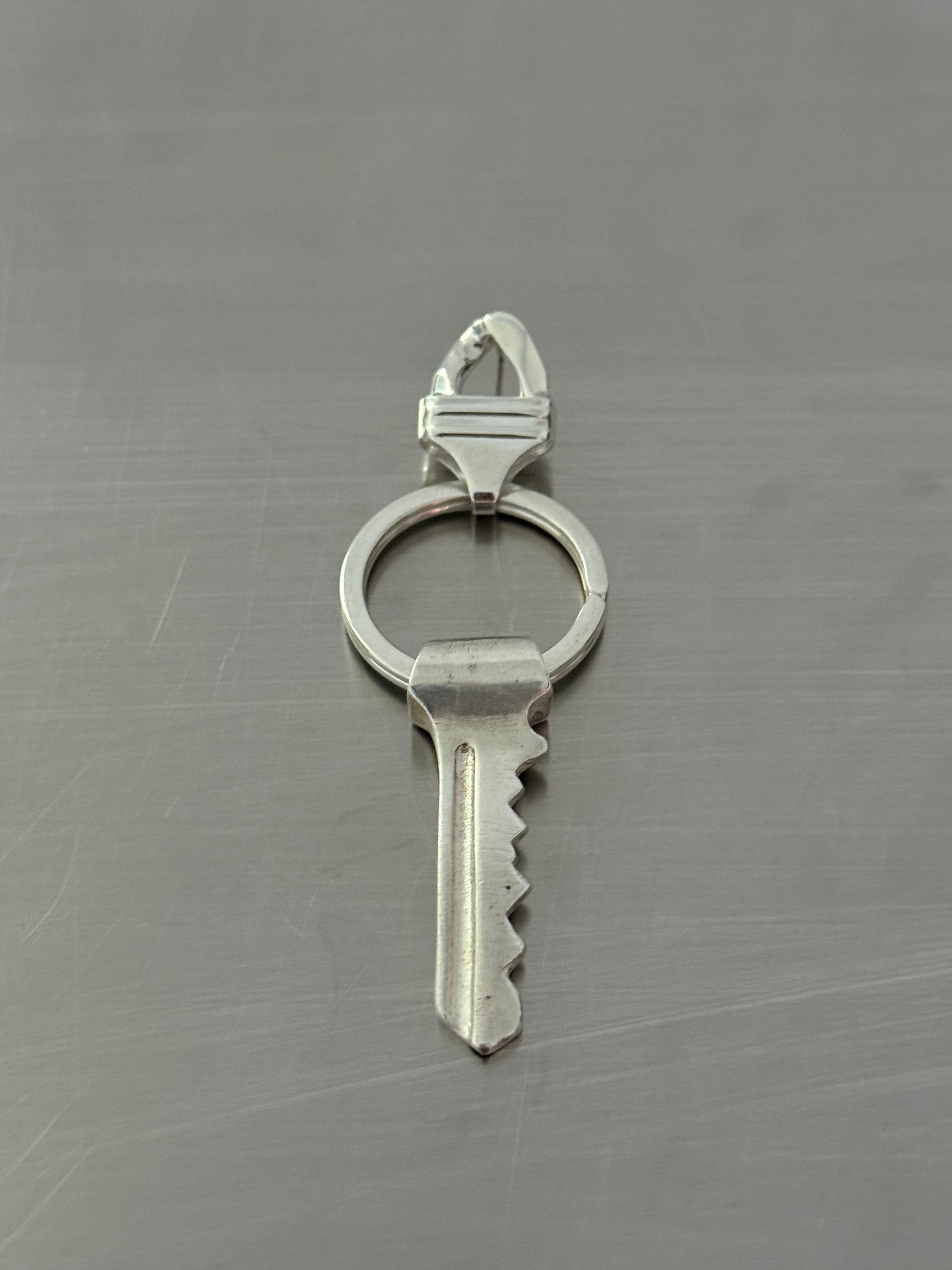 The Key Drop Earring transforms an everyday object into sculptural hardware. Cast in solid sterling silver, the oversized key silhouette hangs from a clean post connection, creating a long vertical drop that catches light with every movement.