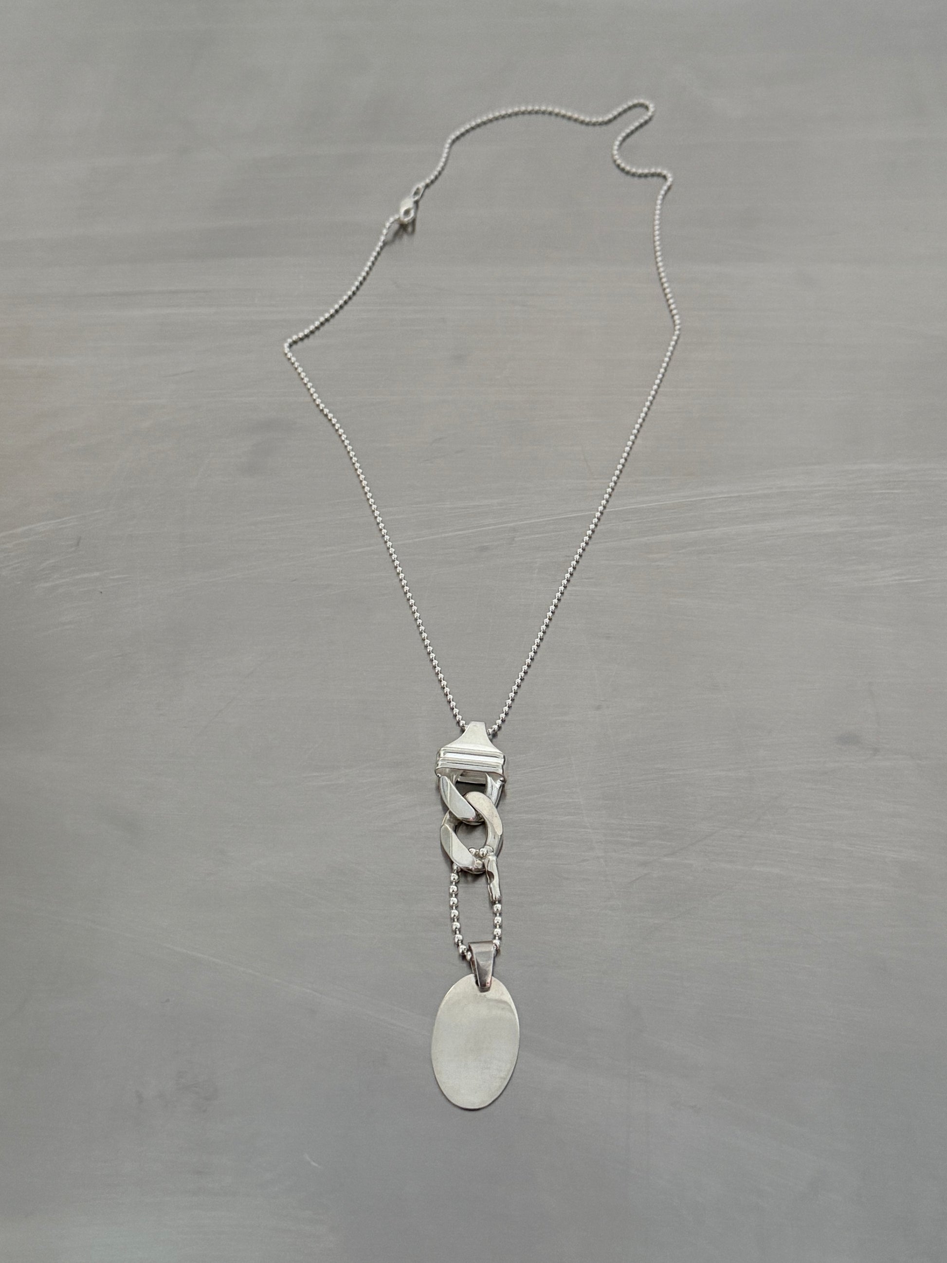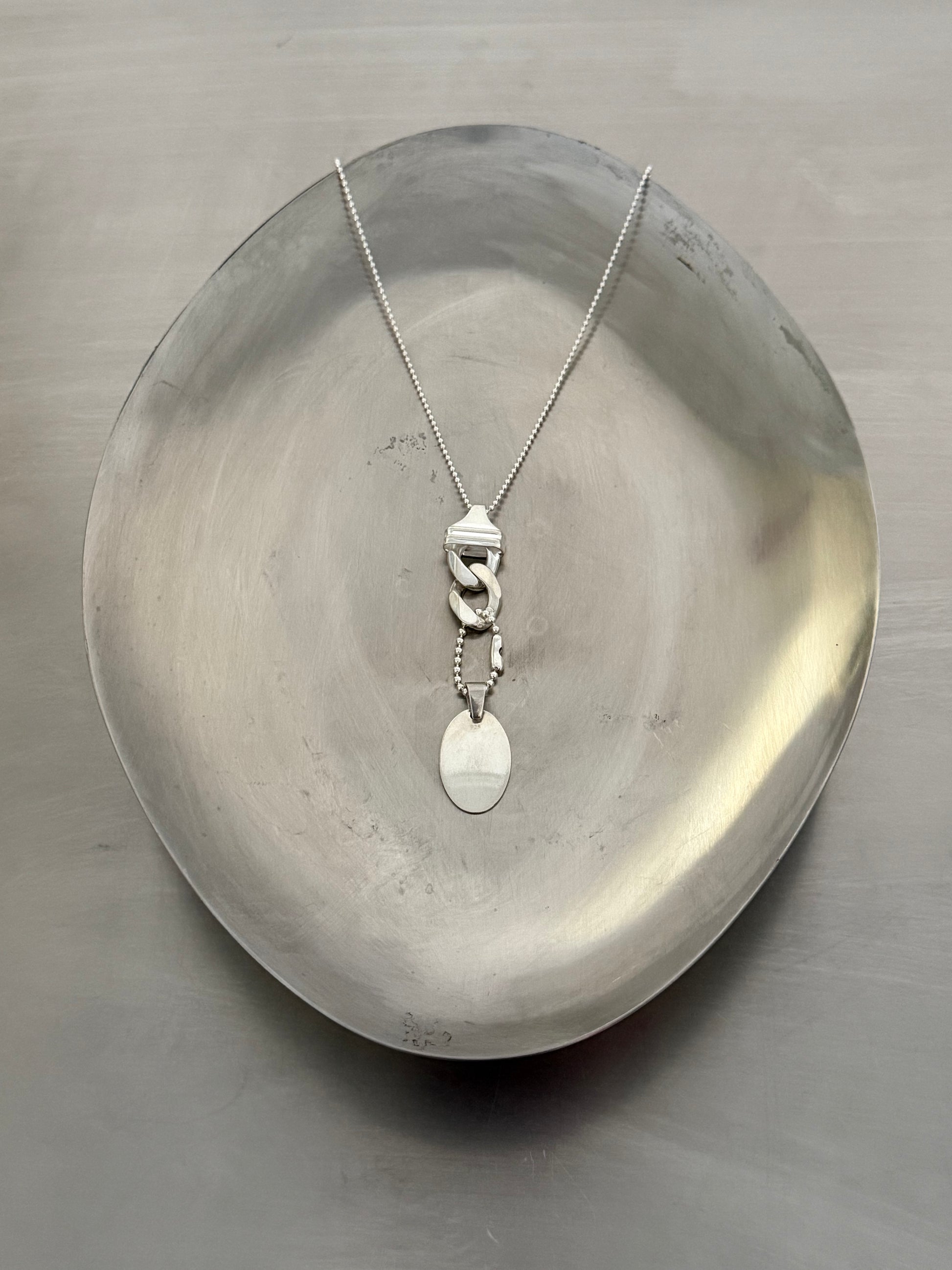 The OX Tag Necklace channels industrial hardware into something intimate and wearable — a sculptural silver tag suspended from a fine ball chain, finished with our signature clasp detail. Clean lines. Quiet weight. A piece that feels personal, like something you’ve always owned.
