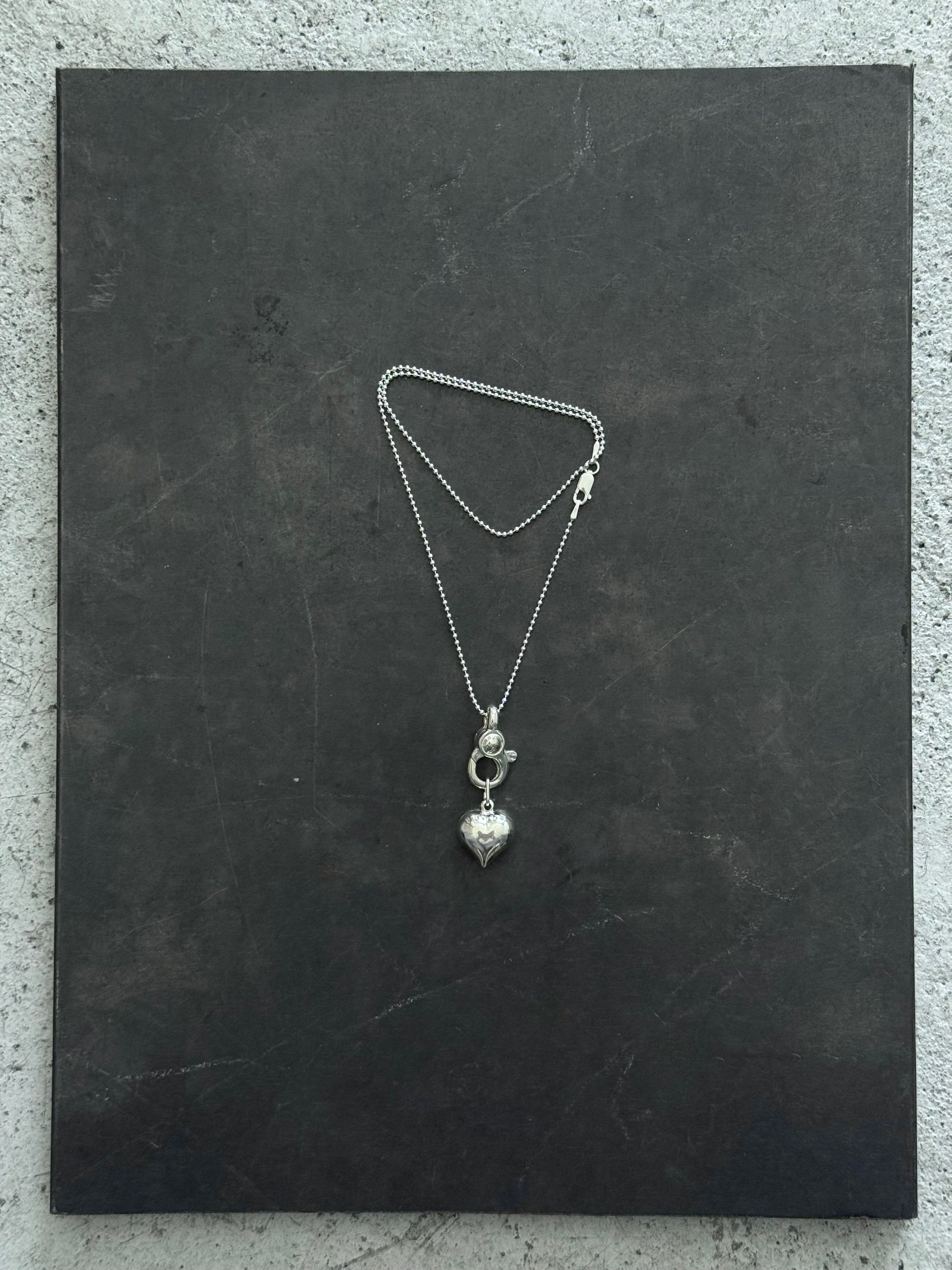 The Uzu Luv Necklace blends sentiment with signature Martine Ali utility. A sculptural heart pendant hangs from functional hardware detailing, suspended on a fine ball chain for a clean, industrial finish.